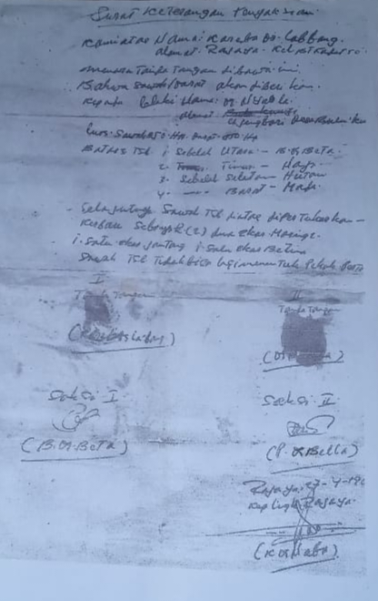 “Kami dari dulu telah menggarap lahan tersebut, bahkan sebelum kemerdekaan, nenek dan orang tua kami telah menguasai dan menggarapnya dan sama sekali tidak pernah menjual kepada siapapun. Namun kini ada oknum yang berani mengklaim dan mengaku-ngaku sebagai lahan miliknya dengan hanya menunjukkan selembar kertas surat pernyataan yang ditulis tangan dan itupun bukan atas nama Bundu Dg. Beta sebagai penjual.” Tayeb kembali menegaskan bahwa kamilah pihak yang selama bertahun-tahun menguasai, menggarap dan membayar pajak lahan tersebut.